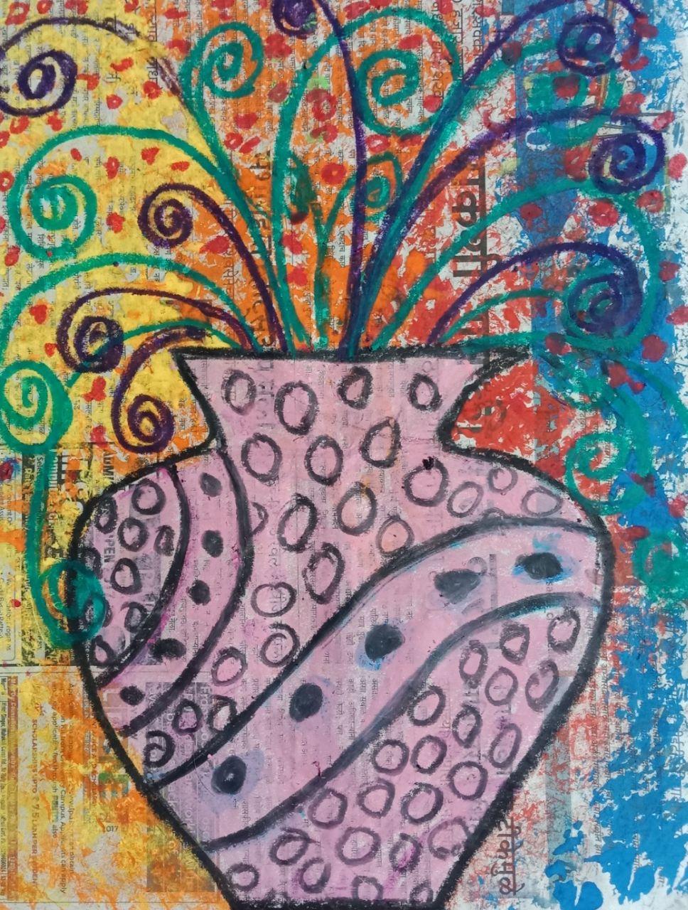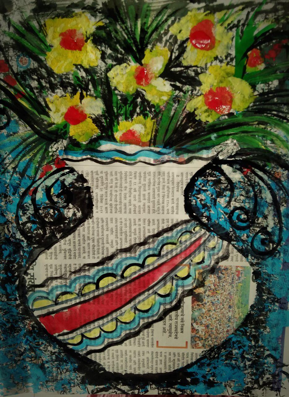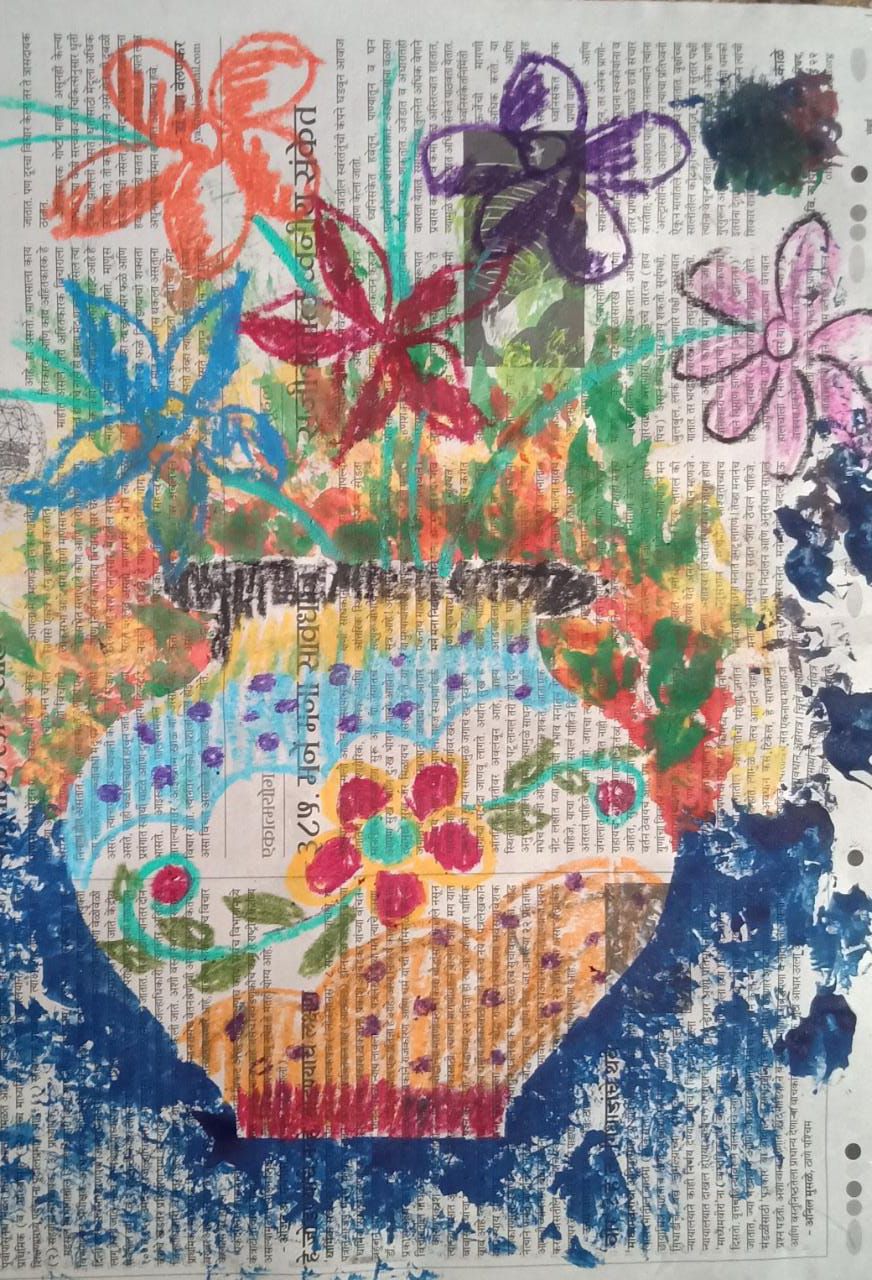 आज के चित्र मे कोई भी बेकार कागज या न्युजपेपर लेना है।दुसरे एक कागज को बीच से मोडकर उसपर आधा फ्लॉवरपॉट का आकार बनाकर काटना कागज खोलनेपर पुरा आकार दिखेगा।बाद मे उसको न्युजपेपर पर रखना और उसपे वजन रखना फिर किसी कागज को मोडकर उस मुडे हुए कागज से कलर मे डुबाकर अलग-अलग कलरसे छापना।बाद मे पॉट के अंदर कलर करके डिझाइन बनाना।और पॉट के उपर लाईन्स और फूल बनाना।