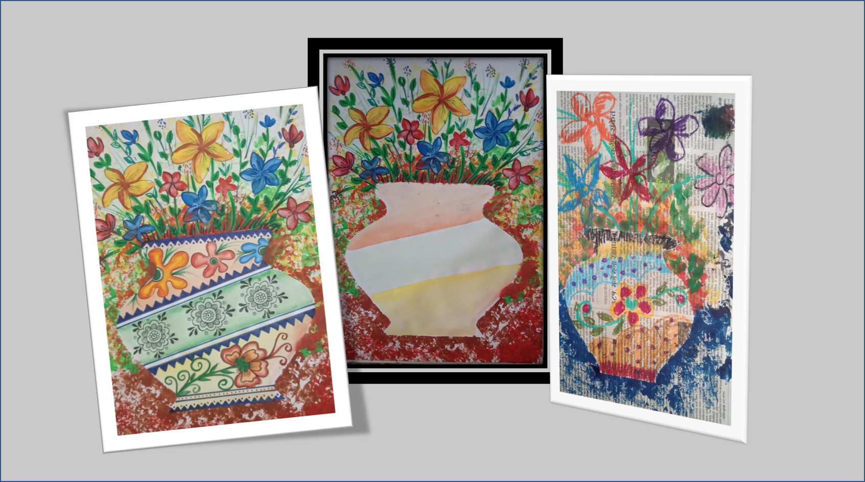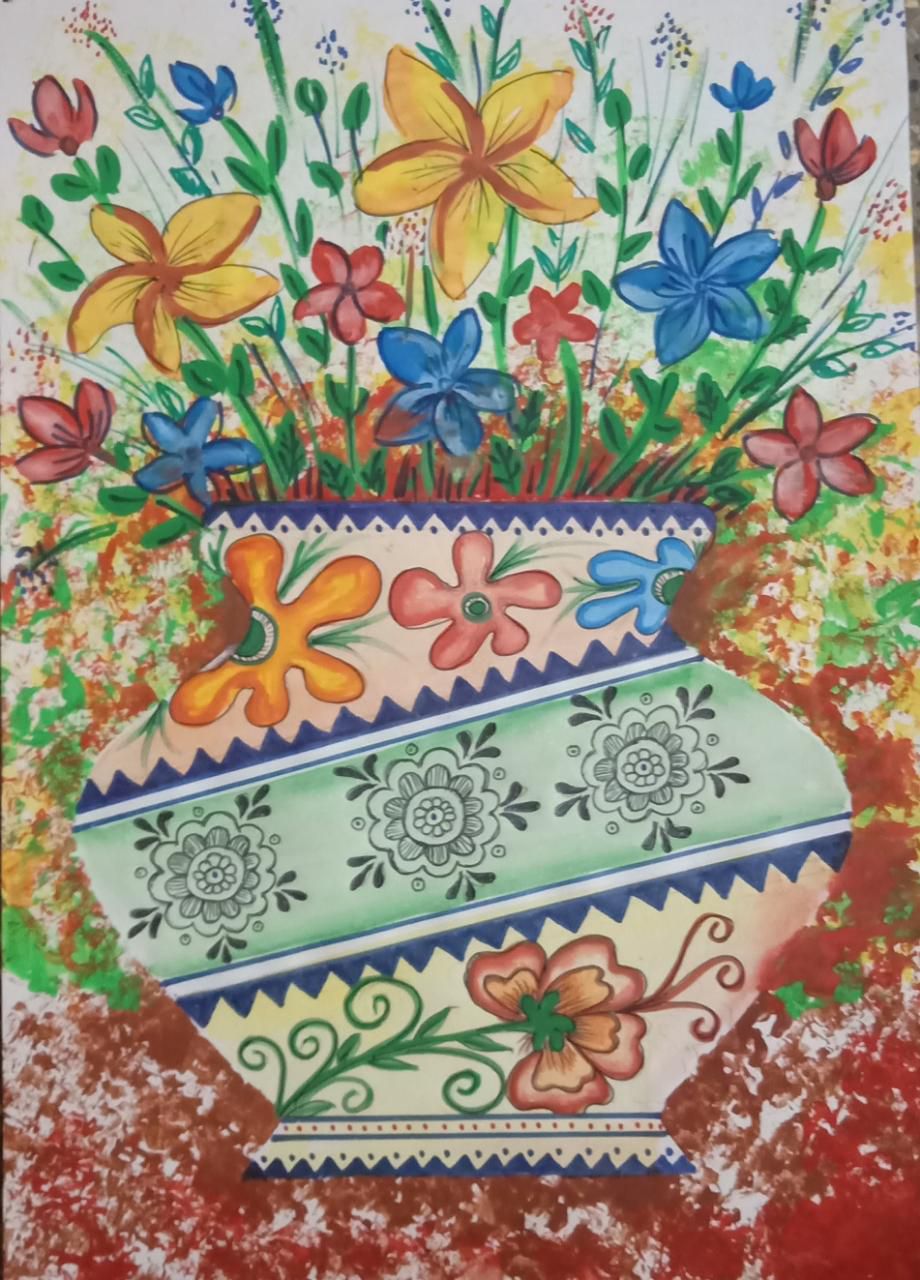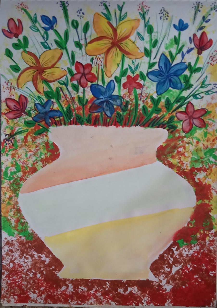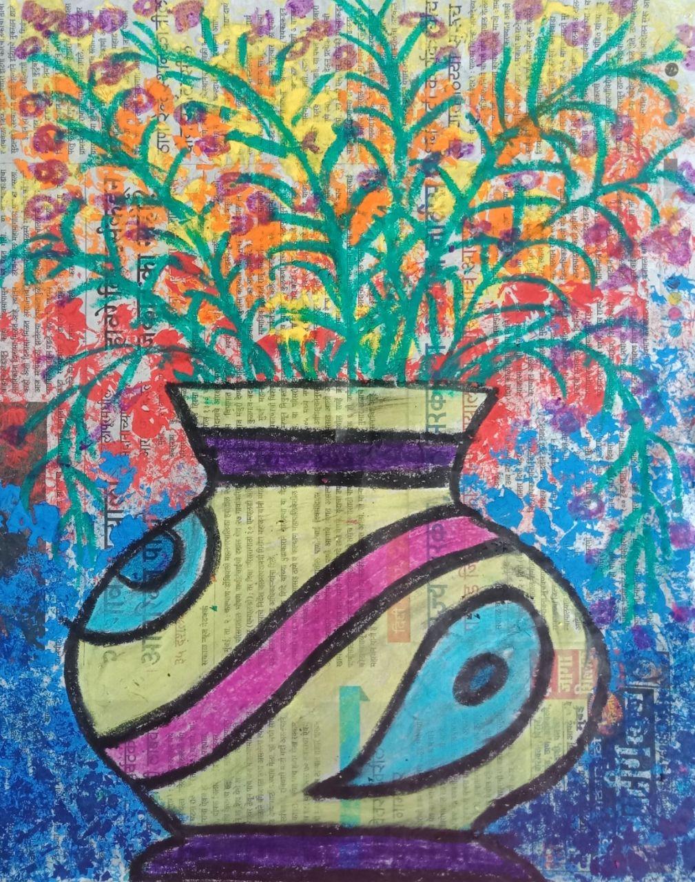 आज के चित्र मे कोई भी बेकार कागज या न्युजपेपर लेना है।दुसरे एक कागज को बीच से मोडकर उसपर आधा फ्लॉवरपॉट का आकार बनाकर काटना कागज खोलनेपर पुरा आकार दिखेगा।बाद मे उसको न्युजपेपर पर रखना और उसपे वजन रखना फिर किसी कागज को मोडकर उस मुडे हुए कागज से कलर मे डुबाकर अलग-अलग कलरसे छापना।बाद मे पॉट के अंदर कलर करके डिझाइन बनाना।और पॉट के उपर लाईन्स और फूल बनाना।